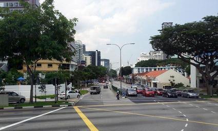Keywords: balestier neighbourhood singapore public domain publicdomain thomson road traffic junction vehicles outdoor intersection Single-storey shophouses on the right Single-storey shophouses on the right
