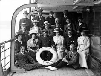 | Keywords: ss copeland sscopeland 1910 glasgow passengers hats group portrait eighteen edwardian fashion edwardianfashion ship steamer clyde shipping company clydeshippingcompany clyde shipping co. clydeshippingco clyde shipping clydeshipping w.b. thompson & co. wbthompsonco w.b. thompson wbthompson torpedoed sunk by u-57 sunkbyu57 u-57 u57 cork poole collection poolecollection glass negative glassnegative a.h. poole ahpoole arthur henri poole arthurhenripoole people identified peopleidentified captain mclaughlin captainmclaughlin waterford national library of ireland nationallibraryofireland blackandwhite monochrome black and white Passengers on board the SS Copeland. While sailing from Glasgow to Cork in December 1917, this ship was torpedoed and sank off Tuskar Rock with the loss of 12 crew. Had wondered if the moustached captain (id-ed by rolfiecar as Capt. McLaughlin) holding the lifebelt is the same man depicted in this 1898 sketch by Ernest Arthur Binstead in the University of Glasgow Library's Photostream. However, RETRO STU pointed out that sleeve insignia suggest that the man holding the lifebuoy was "a Commander (a rank below the level of Captain) and the man to his left could be his second in command, the ship's Lieutenant." Date: 18 June 1910 NLI Ref.: P_WP_2038 Passengers on board the SS Copeland. While sailing from Glasgow to Cork in December 1917, this ship was torpedoed and sank off Tuskar Rock with the loss of 12 crew. Had wondered if the moustached captain (id-ed by rolfiecar as Capt. McLaughlin) holding the lifebelt is the same man depicted in this 1898 sketch by Ernest Arthur Binstead in the University of Glasgow Library's Photostream. However, RETRO STU pointed out that sleeve insignia suggest that the man holding the lifebuoy was "a Commander (a rank below the level of Captain) and the man to his left could be his second in command, the ship's Lieutenant." Date: 18 June 1910 NLI Ref.: P_WP_2038 |