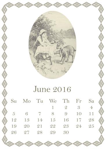 Keywords: june 2016 calendar girl child goat table countryside field grass tree spring summer diamond hat bell food water pond lake tablecloth happy animal