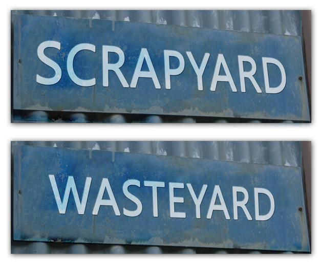 Keywords: junkyard car cemetery scrap note board shield labeled corrugated sheet
