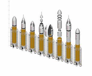 | Keywords: Jupiter Family.jpg A few of the many possible configurations of the Jupiter Launch Vehicle family From left to right Jupiter-120 Cargo Launch Vehicle configuration with low-CD Ogive 8 4m diameter Payload Fairing and Long style Aft Engine Mount Structure Jupiter-120 Crew Cargo configuration w/ 8 4m dia PLF Orion Spacecraft and Pod style Aft Engine Mounting Structure Jupiter-120 Cargo configuration using standard PLF and an 18ft 'Cap' Jupiter-120 Crew Cargo configuration with Orion spacecraft and a 10 0m dia PLF Jupiter-120 Cargo configuration using 10 0m PLF Jupiter-232 Lunar EDS/Propellant-only configuration with minimal fairing exploded image Jupiter-232 Lunar Crew Spacecraft configuration with 10 0m dia PLF For more information please visit www directlauncher com 2008-10-17 own assumed Kraisee DIRECT Exploded views |