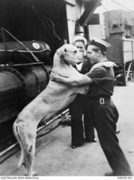 | Keywords: Just Nuisance with sailors AWM P08459.001.JPG en A portrait of a Great Dane and an unidentified Serviceman from NX18122 Warrant Officer Class 1 WO1 Darrell Noel Anderson wrote on the verso This picture was taken in Cape Town The dog is known to all the naval chaps as he takes them home when they are drunk He pulls them along the street He comes from a town outside Cape Town he gets on the train himself and goes home with drunk sailors It is possibly the same dog as that pictured in P07849 005 and P07849 006 1942 P08459 001 Copyright expired - public domain PD-Australia author Uploaded with UploadWizard Just Nuisance |