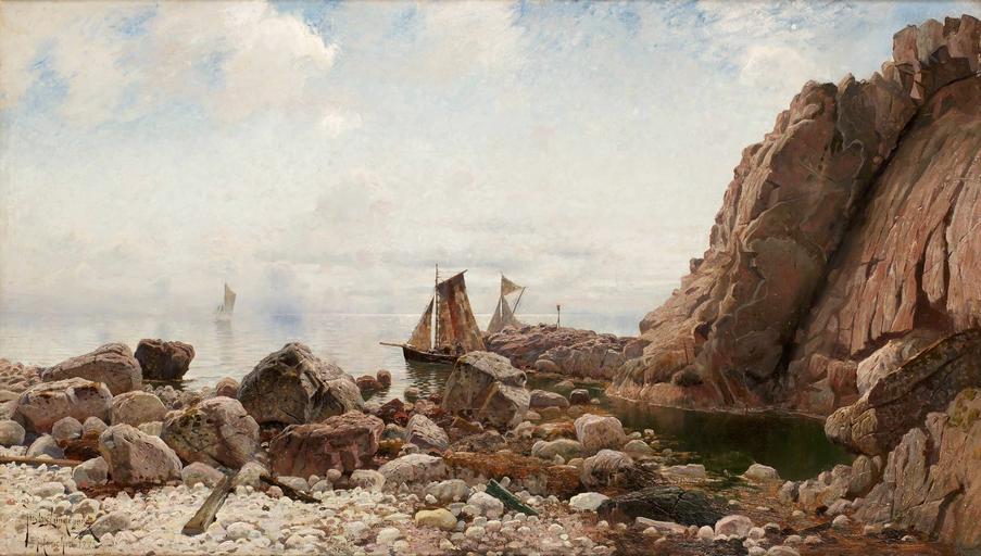Keywords: Justus Lundegård - Segelskutor för ankar vid klippvägg.jpg Segelskutor för ankar vid klippvägg sv Justus Lundegård 1860-1924 1885-86 oil canvas cm 104 181 bukowskis se Justus Lundegård Paintings of ships PD-old-70