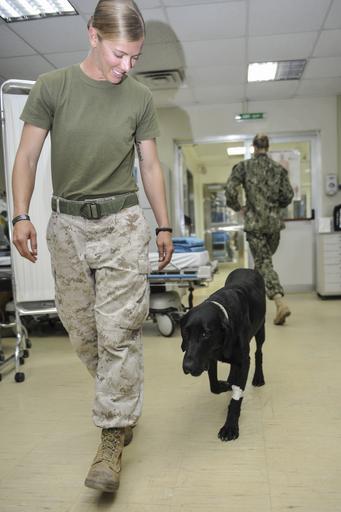 | Keywords: K9 patient 140113-N-LE393-111.jpg en U S Marine Corps Cpl Johanna Robbins a military working dog handler with the 13th Marine Expeditionary Unit law enforcement detachment walks with Quick a black lab explosives search dog following a veterinary procedure to clean out his ear canals Quick had earwax dirt and a yeast infection in his ears U S Navy photo by Mass Communication Specialist 1st Class Eric Dietrich/Released 2014-01-13 Petty Officer 1st Class Eric Dietrich https //www dvidshub net/image/1150217 140113-N-LE393-111 2014-01-14 08 03 CAMP LEMONNIER DJ PD-USGov-Military-Navy 13th Marine Expeditionary Unit Camp Lemonnier Images from DoD uploaded by Fæ |