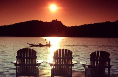 Keywords: KA Sunset Dock.JPG en Kayaker from Pow Wow Point Lodge own Muskokagirl 2008-07-01 Orange sunsets Muskoka Lakes Ontario Beach chairs Kayakers from Canada