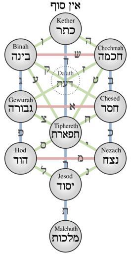 | Keywords: Kabbalistic Tree of Life (Sephiroth) 2.svg Tree of life with the 10 Sephiroth and the 22 Hebrew characters as they are presented in the Sefer Yetzirah Book of Formation The different colors of the lines represent the three groups of characters ;red the 3 mother letters ;blue the 7 double letters ;green the 12 simple letters own -- an equivalent graphic to File Tree of Life Sephiroth svg with symmetric geometry and attempting to be more legible created by modifying PD image File Kabbalistic Tree of Life Sephiroth svg Kabbalistic Tree of Life Sephiroth svg 2014-12-25 AnonMoos Tree of life Kabbalah |