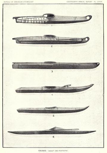 | Keywords: Kaiaks Nelson.JPG en 6 examples of kayaks built and used by Yu'pik 1-3 and Inupiaq 4-6 hunters on the Alaska coast late 1800s 1 and 2 Nunivak; 3 St Michael; 4 King Island; 5 Cape Espenberg; 6 Cape Krusenstern Nelson gives dimensions and some construction details Nelson Edward William The Eskimo About Behring Strait Washington Government Printing Office http //www archive org/stream/eskimoberingstrait00nelsrich page/220/mode/2up/search/Kaiaks Nelson Edward William 1900; kayak examples shown are circa 1880 PD-USGov Kayaks Inuit kayaking History of Alaska Yupik Inupiaq Engravings after pictures by by Edward William Nelson Nunivak Island |