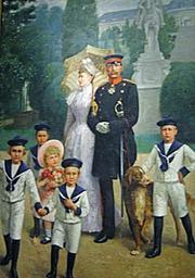 | Keywords: Kaiserpaar1manu.jpg Die kaiserliche Familie im Park von Sanssouci Öl auf Leinwand Deutsches Historisches Museum Berlin own Photograph by Wuselig ca 1894 William Friedrich Georg Pape 1859 “1920 PD-old-70-1923 Kronprinz Friedrich Wilhelm Victor August Ernst 1882 “1951 ˆž 1905 Herzogin Cecilie zu Mecklenburg-Schwerin Prinz Wilhelm Eitel Friedrich Christian Karl 1883 “1942 ˆž 1906-1926 Herzogin Sophie Charlotte von Oldenburg Prinz Adalbert Ferdinand Berengar 1884 “1948 ˆž 1914 Prinzessin Adelheid von Sachsen-Meiningen Prinz August Wilhelm 1887 “1949 ˆž 1908-1920 Prinzessin Alexandra von Schleswig-Holstein-Sonderburg-Glücksburg 1887 “1957 Prinz Oskar Karl Gustav Adolf 1888 “1958 ˆž 1914 Gräfin Ina Maria von Bassewitz 1888 “1973 Prinz Joachim Franz Humbert 1890 “1920 ˆž 1916 Prinzessin Marie Auguste von Anhalt Prinzessin Viktoria Luise Adelheid Mathilde Charlotte 1892 “1980 ˆž 1913 Herzog Ernst August von Braunschweig-Lüneburg Wilhelm II of Germany family 1891 Portraits of Wilhelm II of Germany 1894Augusta Viktoria of Schleswig-Holstein 1894 Princess Viktoria Luise of Prussia 1894 Family portraits of German rulers Wilhelmine Germany William Pape 1891 paintings Paintings in the Deutsches Historisches Museum 1891 19th-century family portraits of royalty 19th-century portrait paintings with dogs Sailor suits in art 19th-century promenade portraits of families German promenade portraits Group portraits with 7 persons Portraits of children in sailor suits Deutsches Historisches Museum - 19th century 1891 1891 in Germany 1890s portrait paintings Paintings of Sanssouci |