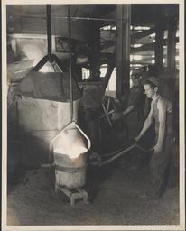 | Keywords: kalamazoo public library michigan history photography stove company furnace iron glasses factory manufacturing workmen Interior of Kalamazoo Stove Company, several unidentified men working. The original photo caption reads, "Kalamazoo Stove Company. #1. 'pouring off' time. This is one of the three giant furnaces in which 'Pigs' (pig iron) have been melted at 2800 degrees. The man in the special colored glasses controls the white hot flow into ladles. 245,000 pounds of iron is used in making Kalamazoo stoves each day." For more information on the Kalamazoo Stove Company read: www.kpl.gov/local-history/business/kalamazoo-stove.aspx KPL catalogue number P-134. Interior of Kalamazoo Stove Company, several unidentified men working. The original photo caption reads, "Kalamazoo Stove Company. #1. 'pouring off' time. This is one of the three giant furnaces in which 'Pigs' (pig iron) have been melted at 2800 degrees. The man in the special colored glasses controls the white hot flow into ladles. 245,000 pounds of iron is used in making Kalamazoo stoves each day." For more information on the Kalamazoo Stove Company read: www.kpl.gov/local-history/business/kalamazoo-stove.aspx KPL catalogue number P-134. |