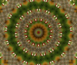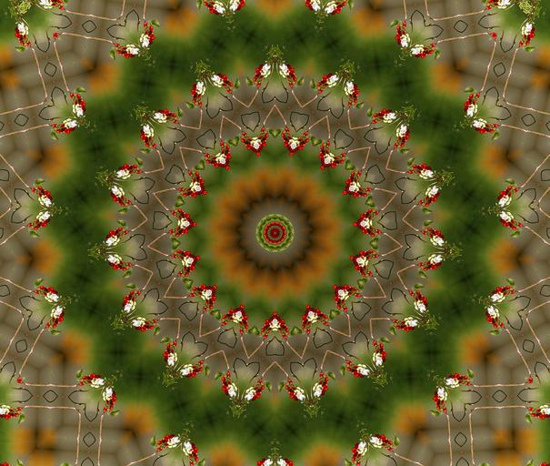 Keywords: kaleidoscope graphics composition symmetry sharp figure outline shapes star circle elements green red white ornament wallpaper