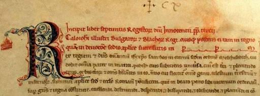 | Keywords: KaloyanInnocent.jpg папа Инокентий ІІІ и бълга ския ца Калоян Детайлът съдъ жа фо мулата Калоян ца на бълга и и власи О игиналът се съх анява в Сек етния а хив на Ватикана http //www zabukvite org/issues 22 zabukvite org Secretary of Innocent III 12th-13th centuries PD-Art Innocentius III in miniatures Kaloyan of Bulgaria Illuminated archival materials |