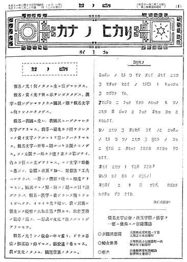 | Keywords: Kana no Hikari, number 1, page 1.png Kana no Hikari number 1 page 1 The Kana no Hikari Light of Kana is the bulletin of Kanamozikai This image was obtained through scanning at 300 dpi Kana no Hikari number 1 page 1 1922 1922-02-20 仮名文字協会 Kana Moji Kyōkai Kana Character Association Public domain Original text Heading 大正十 年二 十五日印刷納 大正十 年二 二十日発行 (毎 回二十日発行) カナ ノ ヒカリ 大正十 年二 二十日 第三種郵便物認可 カナ ノ ヒカリ イ 1 ゴウ Left column カナ ノ ヒカリ 仮名ノ光 何ノタメニ生レ出デマシタカ 仮名ノ貴イ光ヲ世ニ示サンガタメデス 漢字ニ ンデシマツテヰル国民ノ ヲ仮名文字ニ向ケシメルタメデス 仮名ハ我国ニ生レ 我国民ニハグクマレタ文字デアリマス 我等ハ祖先カラ授ケラレタコノ貴イ文字ノアルコトヲ忘レテハナリマセヌ 仮名文字ハ世界ニ誇ルベキ立派ナモノデス ソノ立派サハ外カラ塗リ立テタ彩デナイ 内カラ発スル光デアリマス コノ文字ヲ時勢ニ ジテ 書体ニ改良ヲ加ヘ 記載法ヲ工夫スルナラバ 層ソノ価 ヲ増スニ相違アリマセン 国民ガコノ点ニ向ツテ絶エズ目ヲ注グナラバ 仮名ハ漢字ニ虐ゲラレタ境カラヨミガヘツテ イヨイヨ光ヲ増シ 我ガ民族ニ発生シタ優雅ナ大和 葉ヲ カセ 社会実務ノ能率ヲ高メ 層我ガ文化ヲ メルコトデアリマセウ 仮名ノ光 ソノ使命ハ中 重イ ドウカ各位ノ御援助ヲ仰ギマス 御愛護ヲ希ヒマス 我ガ文化ノタメニ 国運発展ノタメニ Right column カリモノ ニッ ン ノ ヒト ワ イマ オモイ オモイ ニモツ ヲ セオッテ セカイ ノ ヒトビト ト キョウソウ ヲ ツヅケテ イル アセミドロ ニ ナッテ イクラ ハシッテ モ ソノ ニモツ ガ ジャマ ニ ナッテ オモゥ ヨゥ ニ ハシレナイ ソノ ニモツ ヲ オロセバ ヨイ ノニ ニッ ン ノ ヒト ワ ソノ ニモツ ヲ タカラ ノ ヨゥ ニ イジ ニ オモッテ ナカナカ ステヨゥ トワ シナイ オモイ ニモツ ト イエバ ナニカ ソレワ シナ カラ ノ カリモノ オタガイ ニ キ ガ ツケバ カエシテ シマオゥ デワ ナイカ 猿橋式活字 ---- 仮名文字協会ノ改良字体ノ活字ヲ 部ニ使用スル新聞雑誌 少国民新聞 大阪西区京町 丁目 工業之日 社発行 婦女世界 大阪西区 佐 裏町 六 婦女世界社発行 明生 兵庫 西宮町南郷山 教育明生会発行 Reference translation Heading Printed and delivered on February 15 1922 Published on February 20 1922 Published monthly on 20 every month Kana no Hikari Light of kana Approved as third-class postal matter on February 20 1922 Kana no Hikari Light of kana No 1 Left column Kana no Hikari Light of Kana For what purpose you are created It was created to demonstrate precious light of kana to the world It was created to direct eyes of people who are blind by kanji Chinese characters toward kana characters Kana were born in our country and brought up by people of our country We should not forget those precious characters gifted by our ancestors Kana characters are so worthy that we can be proud of them Their worthiness is not a color painted on their surface but a light emitted from their inside If we improve their typefaces and their writing system their value will increase more If people continuously watch this point kana will be brought back to life from the oppression by kanji Chinese characters their light will be brighter they will cast a light on elegant native words grown in our folk they will improve efficiency of our society and they will advance our culture Kana no Hikari Its mission is quite important The editor asks people's assistance and kindness for our culture and our nation's prosperity Right column Thing borrowed Japanese people are now shouldering a heavy burden and competing with people around the world Being all of a sweat they are running but they cannot run as they wish because of the burden Japanese people regard the burden as a treasure and do not try to throw it away when they might unload it What is the heavy burden It was borrowed from China Being aware of the fact why don't we return it Saruhashi-style movable type ---- Newspapers and magazines using movable types having improved typefaces of the Kana Moji Kyōkai Kana Character Association Shō Kokumin Shinbun Juvenile Citizens' Times published by Kōgyō no Nippon Sha Industrial Japan Company Kyōmachi-bōri 1-chōme Nishi Ward Ōsaka Fujo Sekai Women's World published by Fujo Sekai Sha Women's World Company 16 Tosa-bori Uramachi Nishi Ward Ōsaka Meisei published by Kyōiku Meisei Kai Educational Meisei Association Nangō-yama Nishinomiya Town Hyogo Prefecture PD-Japan Magazines of Japan Kanamozikai |