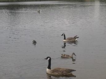 Keywords: Kanadai ludak5.jpg en Two Canada Geese Branta canadensis and a duck in England hu Ket kanadai lúd Branta canadensis es egy rece Angliaban Hampstead Heath Park Dénes Emőke 2010 Branta canadensis feral pairs swimming