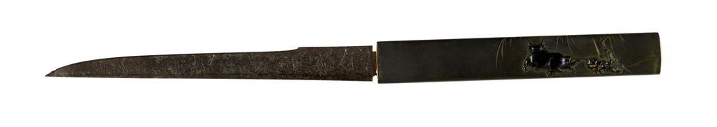 Keywords: Kano Natsuo - Kozuka with Man and Ox - Walters 5111994.jpg At the right of the composition a man is struggling to tie an ox to a tree This is part of a mounted set between 1828 1898 late Edo-Meiji silver gold shakudo copper alloy or sentoku cm 21 accession number 51 1199 4 21682 William T / Henry Walters Collection Baltimore date and mode of acquisition unknown Walters Art Museum Henry Walters Acquired by William T or Henry Walters Signature kita okina zu / natsuo place of origin Edo present-day Tokyo Japan Walters Art Museum license Tosogu Japanese sword fittings in the Walters Art Museum Kano Natsuo Media contributed by the Walters Art Museum needs category review