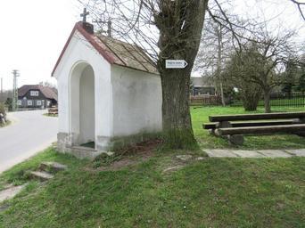 Keywords: Kaplička v Polevsku.JPG cs Kaplička v obci Polevsko zde zatáčí modrá trasa a vede naučná stezka own Zákupák 2015-04-25 Polevsko Chapels in Česká Lípa District