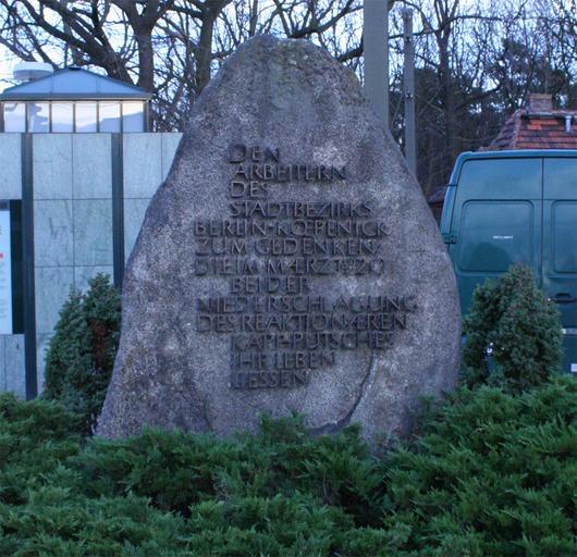 | Keywords: Kapp Putsch memorial, Berlin-Grünau.jpg Gedenkstein für die Köpenicker Opfer des Kapp-Putsches auf dem Marktplatz von Berlin-Grünau Bezirk Treptow-Köpenick Memorial for Köpenick's victims of the Kapp Putsch on the market place of Grünau Treptow-Köpenick Berlin Own 2006-12 Theo Schneider Cosmo Kramer Public domain 52 24 49 N 13 34 27 E Inscription žDen Arbeitern des Stadtbezirks Köpenick zum Gedenken die im März 1920 bei der Niederschlagung des reaktionären Kapp-Putsches ihr Leben ließen To commemorate the workers of Köpenick district who lost their lifes striking down the reactionary Kapp Putsch in March 1920 original upload log Date/Time User Dimensions File size Comment - 3 57 p m Dec 7 2006 Cosmo Kramer 836×807 798 KB Beschreibung Gedenkstein für die beim Kapp-Putsch ermordeten Arbeiter Aufschrift Den Arbeitern des Stadtbezirks Berlin-Köpenick zum Gedenken die im März 1920 bei der Niederschlagung des reaktionären Kapp-Putsches ihr Leben liessen Fotograf T Kapp-Putsch memorial stone in Berlin-Grünau |