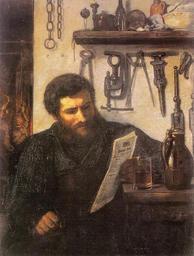 | Keywords: Karel Purkyně - Politizující kovář.jpg Artwork Creator Karel Purkyně По т ет коваля Єха Коваль-політик 1860 ік аціональна гале ея П ага Portrait of blacksmith in his workshop reading Slovenské noviny 1860 Oil on canvas cm 139 106 Institution Národní galerie v Praze object history exhibition history credit line accession number O 4762 http //dejiny nln cz/archiv/2008/4/camera-obscura/clanek Karel Purkyně 1860 paintings 19th-century Czech paintings in the Národní galerie v Praze Paintings of sitting men reading indoors Newspaper readers Paintings of blacksmiths PD-old-100 |