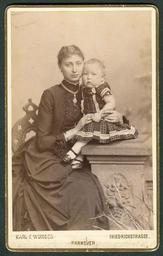 | Keywords: Karl F. Wunder CDV junge Mutter mit Tournüre und Kind Bildseite.jpg Visitkarte einer jungen Mutter mit Kleinkind Die Frau sitzt auf einem Stuhl der schon auf einem anderen Atelierfoto von Wunder zu sehen ist Ob das Foto im Atelier oder oder außerhalb gemacht wurde ist derzeit noch nicht eindeutig definiert Das Podest auf dem das Kind sitz scheint jedenfalls aus echtem Sandstein zu sein und kommt somit als einfache Atelier-Requisite kaum in Frage Die junge Dame lebt wohlhabend ihr Kleid ist eine Kombination mit einer perlenbestickten Tournure à ber dem hochgeschlossenen Stehkragen trägt sie eine Kette mit einer aufwendigen Brosche Scan vom Original Bernd Schwabe in Hannover after 1880 Creator Karl Friedrich Wunder PD-old Karl Friedrich Wunder Unidentified people of Hannover 1880s portrait photographs |