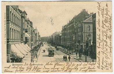 Keywords: Karl F. Wunder PC 0529 Hannover. Königstraße.jpg Karl F Wunder von der alten Eisenbahnbrücke durch die Königstraße zur Eilenriede Am Ende der Straße sieht man undeutlich das Kriegerdenkmal wo heute das Tor vom žNeuen Haus vor der Musikhochschule steht Die Königstraße entstand als erste Straße in der von Laves geplanten Erweiterung der Ernst-August-Stadt jenseits der Bahnanlagen Der Plan wurde erst in den 1850 Jahren umgesetzt als man 1859 mit der Eingemeindung der žVorstadt-Hannover das Stadtgebiet auf einen Schlag in etwa verfünfzehnfachte Das Gebiet um die Königstraße wurde ab 1862 nach König Georg V žGeorg-Stadt genannt während das Gebiet östlich des Schiffgrabens nach der Königin žMarien-Stadt genannt wurde Die Königstraße plante Laves als nördöstliche Verlängerung der auf die Oper zuführenden Theaterstraße Sie sollte das Rückgrat bilden für ein Raster aus sich rechtwinklig kreuzenden Straßen mit Wohnbebauung das an Bahnlinie Bernstraße Volgersweg und Königstraße grenzte Ursprünglich wollte man die Straßen ebenso breit wie in der Ernst-August-Stadt anlegen nach dem Einspruch der Grundstückseigentümer reduzierte man die Straßenbreiten jedoch erheblich Lediglich die Königstraße wurde als žAvenue mit Baumreihen angelegt und wurde ab den 1860er Jahren mit gehobenen Bauten und Stilelementen der Hannoverschen Schule in Verbindung mit Rundbogenstil und gotisierenden Formen renaissancistischen oder romanischen Elementen besiedelt Heute findet man auch noch Bauten aus der Jahrzehnten um die Jahrhundertwende Auf dem Foto erkennen wir ganz rechts den Eingang zum žTivoli -Vergnügungspark einer frühen Touristen-Attraktion mit želektrischem Licht und Musikveranstaltungen Der Park wurde später durch zusätzliche Bahngleise immer mehr eingeengt und dann ganz aufgegeben Ganz links auf dem Foto wirbt eine Markise für den Verkauf von žSchaftenstiefel Marke Triumph und Radfahrerschuhe und hier begutachtet auch der einzige Radfahrer auf dem Bild sein wohl gerade erworbenes Fahrrad Die Straßenbahn in der Bildmitte ist bereits elektrifiziert während nur wenige Pferdekutschen zu sehen sind rechts auch eine größere Schubkarre Großenteils promeniert man im hinteren Bildteil wohl auch gefahrlos mitten auf der Straße Scan vom Original der mir vorliegenden Ansichtskarte Creator Karl Friedrich Wunder before 1901-04-17 Datum des Post-Absende-Stempels 1901-04-17 PD-old <gallery>File Karl F Wunder PC 0529 Hannover Königstraße Back Side jpg</gallery> Numbered postcards by Karl Friedrich Wunder Trams in Hannover Tivoli Hannover Otto Wunder Kriegerdenkmal Emmichplatz Hannover Königstraße Hannover Tram transport in the 1900s Black and white photographs of trams