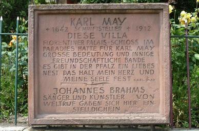 | Keywords: Karl May in Deidesheim 1.jpg en Deidesheim own Immanuel Giel 2010-06 <gallery> Gedenktafel Karl May 01 jpg Gedenktafel vor der Karl May in Deidesheim 2 jpg Villa </gallery> Karl May in Ruppertsberg Plaques to Karl May Johannes Brahms in Ruppertsberg Weinstraße 82 Ruppertsberg |
