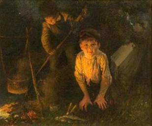 | Keywords: Karl Witkowski - Campers, 1910.jpg Artwork Creator Karl Witkowski Campers At the Campfire 1910 Oil on canvas ' in 25 30 25 K Witkowski ~ lower right signature object history sold at Copley New York 2011 01 17 lot 62 Wood scene two boys cooking meal over campfire one stirring fire with long pole <br /> two fish and cup on grass tent at right <br /> Catalog of Copyright Entries 1910 Engravings Prints Etc Fine Arts Jan-Dec G34614 http //copleyart auctionflex com/showlot ap co 21247 weid 0 weiid 5510033 archive y keyword Witkowski lso timeleftasc pagenum 1 lang En images Copley Boston http //iamachild wordpress com/2010/11/25/karl-witkowski-1860-1910-american/<br /> http //archive org/stream/catalogofcopyrig54libr page/n5/mode/2up PD-old-100 Karl Witkowski Uploaded with UploadWizard Paintings of boys |