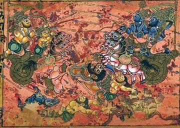 | Keywords: Karna kills Ghatotkacha.jpg en This charged scene is from the Mahabharata Great Story of the Bharatas a sacred Hindu epic of ancient India that narrates the great war between two related clans the Pandavas and the Kauravas In this scene Karna mightiest warrior of the Kauravas slays Ghatotkacha the giant demon of the Pandavas On the right the blue-skinned god Krishna drives the chariot for the Pandava hero Arjuna Although the artist of this Mahabharata adopted the sharp noses and large oval eyes of the Vijayanagara court tradition his style is unique The figures which exhibit rounded contours and emphatic modeling are charged with energy http //www asia si edu/collections/singleObject cfm ObjectNumber F1975 4 Author 1670 PD-old-100 Kurukshetra War Karna Ghatotkacha |