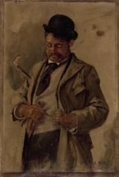 Keywords: Karvaly Férfi sétapálcával.jpg Artwork Mór Karvaly 1850 “1899 Oil on canvas cm 32 5 48 5 Private collection accession number object history credit line http //www kieselbach hu/m-2518 kieselbach hu PD-old Mór Karvaly