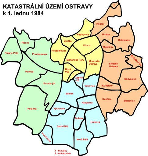 Keywords: Katastrální území Ostravy 1984.png Katastrální území Ostravy k 1 lednu 1984 vlastní dílo založené na Ostravském sborníku 13 2007-05-05 Lukáš Mižoch ;Barevná legenda <span style background-color ffff99; >Ostrava 1</span> <span style background-color ffcc99; >Ostrava 2</span> <span style background-color ccffff; >Ostrava 3</span> <span style background-color ccffcc; >Ostrava 4</span> Municipal parts of Ostrava Maps of Ostrava