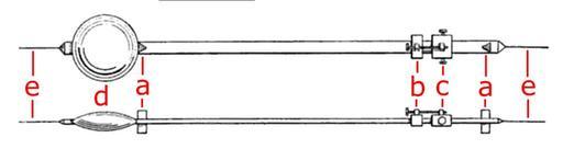 | Keywords: Kater pendulum.png Kater pendulum from a 1920 physics textbook Invented in 1817 by British physicist Henry Kater it was used to measure the local acceleration of gravity in geophysical surveys The labeled parts are identified in the text as a opposing knife edges on either end from which pendulum is suspended b fine adjustment weight operated by adjustment screw c coarse adjustment weight d bob e pointers for reading Alterations to image removed part labels and replaced with different labels in color converted from JPG to 32 color PNG Downloaded November 25 2008 from http //books google com/books id drMEAAAAMAAJ pg PA127 William Watson 1920 A Textbook of Physics 7th Ed Longman's Green Co p 127 fig 88 on Google Books William Watson 1920 Public domain Watson died in 1903 Image Kater pendulum vertical png is a vertical version of this image PD-old Diagrams of pendulums Gravimetry |