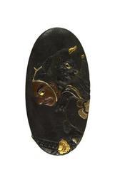 | Keywords: Katsunaga - Kashira with Ômori Hikohichi Carrying a Demon Across a Stream - Walters 511075.jpg Ômori Hikohichi a 14th-century warrior is shown with a female demon on his back Hikohiki is said to have offered to carry a beautiful woman across a stream While crossing the stream he saw her reflection as a demon in the water In some versions of the story he kills her while in others she runs away When the story was adapted for use in theatrical dramas the woman was portrayed as the daughter of Kusunoki no Masahige who erroneously thought Hikohichi was responsible for her father's death The daughter was not actually a demon but wore a mask to frighten Hikohichi This is part of a set with Walters 51 1074 date shibuichi copper gold cm 3 3 accession number 51 1075 31942 William T / Henry Walters Collection Baltimore date and mode of acquisition unknown Walters Art Museum Henry Walters Acquired by William T or Henry Walters none place of origin Japan Walters Art Museum license Tosogu Japanese sword fittings in the Walters Art Museum Media contributed by the Walters Art Museum needs category review Katsunaga |