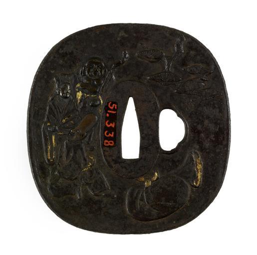 | Keywords: Kawaji Tomotsugu - Tsuba with the Seven Gods of Fortune - Walters 51338 - Back.jpg The Seven Gods of Good Fortune Shichifukujin are a Japanese folk tradition that emerged from Buddhist Taoist and Shinto beliefs On the front Daikoku the god of wealth appears that the upper right with bales of rice Next to him is Jurôjin the god of wisdom or longevity At the bottom is Bishamon who is the god of warriors On the left is Ebisu the god of fishing or daily food On the reverse the remaining three gods are shown on the left side At the bottom is Fukurokuju the god of longevity In the middle is Benzaiten the only female and the goddess of music At the top is Hotei the god of happiness and good health Hotei's bag of treasures appears on the right These gods also appear individually and in other groupings Their spheres of influence are not fixed and they sometimes appear with other traits between 1669 1712 early Edo iron gilt shakudo shibuichi copper cm 8 8 8 5 0 45 accession number 51 338 22816 Henry Walters Baltimore date and mode of acquisition unknown Walters Art Museum Henry Walters Acquired by Henry Walters Place and Signature Choshu Hagi ju/Kawaji Tomotsugu saku; Translation Residing in Hagi Choshu province/made by Kawaji Tomotsugu place of origin Hagi Japan Walters Art Museum license Tsuba in the Walters Art Museum Kawaji Tomotsugu Media contributed by the Walters Art Museum needs category review |