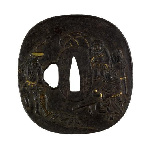 | Keywords: Kawaji Tomotsugu - Tsuba with the Seven Gods of Fortune - Walters 51338.jpg The Seven Gods of Good Fortune Shichifukujin are a Japanese folk tradition that emerged from Buddhist Taoist and Shinto beliefs On the front Daikoku the god of wealth appears that the upper right with bales of rice Next to him is Jurôjin the god of wisdom or longevity At the bottom is Bishamon who is the god of warriors On the left is Ebisu the god of fishing or daily food On the reverse the remaining three gods are shown on the left side At the bottom is Fukurokuju the god of longevity In the middle is Benzaiten the only female and the goddess of music At the top is Hotei the god of happiness and good health Hotei's bag of treasures appears on the right These gods also appear individually and in other groupings Their spheres of influence are not fixed and they sometimes appear with other traits between 1669 1712 early Edo iron gilt shakudo shibuichi copper cm 8 8 8 5 0 45 accession number 51 338 22816 Henry Walters Baltimore date and mode of acquisition unknown Walters Art Museum Henry Walters Acquired by Henry Walters Place and Signature Choshu Hagi ju/Kawaji Tomotsugu saku; Translation Residing in Hagi Choshu province/made by Kawaji Tomotsugu place of origin Hagi Japan Walters Art Museum license Tsuba in the Walters Art Museum Kawaji Tomotsugu Media contributed by the Walters Art Museum needs category review |