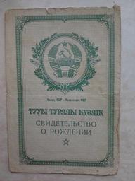 | Keywords: Kazakh Soviet Birth Certificate 1955.jpg ru Свидетельство о ождении Казахская ССР СССР 1958 год kk Тууы ту алы куәлік Қазақ КСР КСРО 1958 жыл en Birth certificate Kazakh SSR USSR 1958 de Geburtsurkunde Kasachische SSR Sowjetunion 1958 fr Acte de naissance République socialiste soviétique kazakhe URSS 1958 zh 出生證明書 哈萨克苏维埃社会主义共和国 苏联 1958年 es Certificado de Nacimiento RSS de Kazajistán URSS 1958 pt Certidão de nascimento República Socialista Soviética Cazaque URSS 1958 pl Świadectwo urodzenia Kazachska Socjalistyczna Republika Radziecka ZSRR 1958 own Spacekid 2014-05-21 Birth certificates of the Soviet Union Cc-zero |