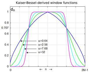 | Keywords: Kbd-window.jpg en Kaiser-Bessel derived KBD window function for different alpha values 2013-02-27 own Bob K The JPG image generated by the enclosed Octave script replaces the 5/1/2009 version which is a derivative of Kbd-window svg by RetoGalli Octave script <source lang Matlab > graphics_toolkit gnuplot N 129; M N-1; colors 0 0 1; 0 1 0; 0 1 1; 1 0 1; alphas 0 64 2 56 7 68 32; figure title 'Kaiser-Bessel-derived window functions' xlim 0 2 M-1 ylim 0 1 1 grid on ylabel ' ' create left margin set gca 'XTick' 0 1/8 1 2 M-1 set gca 'XTickLabel' ' 0'; ' '; ' '; ' '; ' '; ' '; ' '; ' '; '2M-1 ' set gca 'YTick' 0 0 2 0 4 0 6 0 707 0 8 1 0 text 2 1 05 'd_n' 'fontsize' 14 text 100 -0 05 '\leftarrow n \rightarrow' hold on for graph 1 4 alpha alphas graph ; color colors graph ; w besseli 0 pi alpha sqrt 1- 2 0 M /M -1 2 /besseli 0 pi alpha ; d zeros 1 2 M ; for n 0 M-1 d 1+n sum w 1+ 0 n ; end for n M 2 M-1 d 1+n sum w 1+ 0 2 M-1-n ; end d sqrt d/sum w 1+ 0 M ; plot 0 2 M-1 d 'color' color 'linewidth' 2 end hold off text 96 47 '\alpha 0 64' text 96 40 '\alpha 2 56' text 96 33 '\alpha 7 68' text 96 26 '\alpha 32' </source> </nowiki> Uploaded with derivativeFX Signal processing |