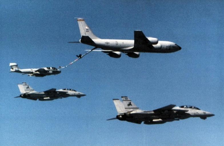 Keywords: KC-135R refuels EA-6B and F-14As off Iraq c1997.jpg A U S Navy Grumman EA-6B Prowler from Electronic Attack Squadron VAQ-135 Black Ravens refuels from a U S Air Force Boeing KC-135R Stratotanker while two Grumman F-14A Tomcat from Fighter Squadron VF-213 Black Lions await their turn The U S Navy aircraft were patrolling the no-fly zone over Southern Iraq and they were assigned to Carrier Air Wing 11 CVW-11 aboard the aircraft carrier USS Kitty Hawk CV-63 for a deployment to the Western Pacific and the Indian Ocean from 11 October 1996 to 11 April 1997 U S Navy photo http //navysite de/cruisebooks/cv63-97/073 htm from the http //navysite de/cruisebooks/cv63-97/index_004 htm USS Kitty Hawk CV-63 1996-97 cruise book available at http //navysite de/cruisebooks/index html Navysite de ca 1997 USN PD-USGov-Military-Navy Grumman EA-6 Prowler in flight Ž Aerial refueling of F-14A Tomcat Aerial photographs of F-14 Tomcat in flight KC-135R Stratotanker Fighter Squadron 213 United States Navy Electronic Attack Squadron 135 United States Navy |