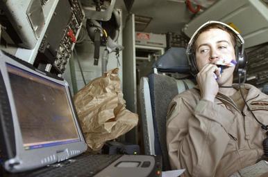 | Keywords: KC-135R-T Stratotanker DVIDS21000.jpg en Airman 1st Class John Reschke has lunch aboard a KC-135R/T Stratotanker while on the way to an air refueling mission in support of Operation Iraqi Freedom With a little more than two years in the U S Air Force and only a few weeks after accomplishing certification in his job as the refueling boom operator he was deployed to the 340th Expeditionary Air Refueling Squadron Southwest Asia Sitting at the former navigation station he is enjoying a candy bar while keeping an eye on a GPS aided laptop that shows a constantly moving updated display of the aircraft's position on a standard navigational chart This is one of many onboard systems that helps the crew know exactly where they are day or night and in all weather conditions He is a native of Orlando Fla and is stationed with the 905th Air Refueling Squadron Grand Forks Air Force Base ND U S Air Force photo/Master Sgt Lance Cheung 2006-05-14 Lance Cheung https //www dvidshub net/image/21000 21000 2006-05-22 14 22 PD-USGov Grand Forks Air Force Base Images from DoD uploaded by Fæ |