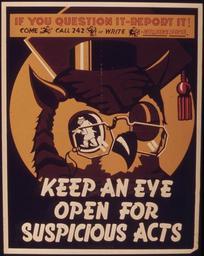 | Keywords: "Keep an eye open for suspicious acts." - NARA - 514758.tif Scope and content General notes 514758 Local identifier 44-PA-1162 Office for Emergency Management Office of War Information Domestic Operations Branch Bureau of Special Services 03/09/1943 - 09/15/1945 Still Picture Records Section Special Media Archives Services Division NWCS-S National Archives at College Park 8601 Adelphi Road College Park MD 20740-6001 1941 - 1945 Record group Record Group 44 Records of the Office of Government Reports 1932 - 1947 Record group ARC 373 World War II Posters compiled 1942 - 1945 Series ARC 513498 File unit File unit ARC Variant control numbers NAIL Control Number NWDNS-44-PA-1162 yes Other versions <gallery> File Keep_an_eye_open_for_suspicious_acts _-_NARA_-_514758 tif tif File Keep_an_eye_open_for_suspicious_acts _-_NARA_-_514758 jpg jpg </gallery> NARA-cooperation PD-USGov World War II posters from the United States NARA TIF images with categorized JPGs |
