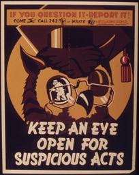 | Keywords: "Keep an eye open for suspicious acts." - NARA - 514758.jpg Scope and content General notes 514758 Local identifier 44-PA-1162 Office for Emergency Management Office of War Information Domestic Operations Branch Bureau of Special Services 03/09/1943 - 09/15/1945 Still Picture Records Section Special Media Archives Services Division NWCS-S National Archives at College Park 8601 Adelphi Road College Park MD 20740-6001 1941 - 1945 Record group Record Group 44 Records of the Office of Government Reports 1932 - 1947 Record group ARC 373 World War II Posters compiled 1942 - 1945 Series ARC 513498 File unit File unit ARC Variant control numbers NAIL Control Number NWDNS-44-PA-1162 Other versions <gallery> File Keep_an_eye_open_for_suspicious_acts _-_NARA_-_514758 tif tif File Keep_an_eye_open_for_suspicious_acts _-_NARA_-_514758 jpg jpg </gallery> NARA-cooperation PD-USGov World War II posters from the United States Owls in art |