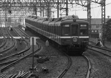 Keywords: Keisei 1000 Takasago 1990.JPG en Keisei 1032 at Takasago Station ja 高砂駅に 入する京成1000形電車 Own Hahifuheho 1990 cc-0 1990 in rail transport in Japan Keikyu 1000 series Black and white photographs of trains in Japan