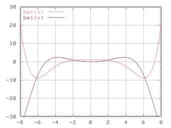 | Keywords: Kelvin Bessel function.png Plot of zeroth order Kelvin-Bessel functions ber x and bei x Made with the following Gnuplot 3 7 script Define zeroth order Kelvin-Bessel functions ber x 1 -1 x/2 4 / 1 2 2 +1 x/2 8 / 1 2 3 4 2 -1 x/2 12 / 1 2 3 4 5 6 2 +1 x/2 16 / 1 2 3 4 5 6 7 8 2 -1 x/2 20 / 1 2 3 4 5 6 7 8 9 10 2 +1 x/2 24 / 1 2 3 4 5 6 7 8 9 10 11 12 2 -1 x/2 28 / 1 2 3 4 5 6 7 8 9 10 11 12 13 14 2 +1 x/2 32 / 1 2 3 4 5 6 7 8 9 10 11 12 13 14 15 16 2 -1 x/2 36 / 1 2 3 4 5 6 7 8 9 10 11 12 13 14 15 16 17 18 2 bei x +1 x/2 0 2/ 1 2-1 x/2 0 6/ 1 2 3 2 +1 x/2 0 10/ 1 2 3 4 5 2 -1 x/2 0 14/ 1 2 3 4 5 6 7 2 +1 x/2 0 18/ 1 2 3 4 5 6 7 8 9 2 -1 x/2 0 22/ 1 2 3 4 5 6 7 8 9 10 11 2 +1 x/2 0 26/ 1 2 3 4 5 6 7 8 9 10 11 12 13 2 -1 x/2 0 30/ 1 2 3 4 5 6 7 8 9 10 11 12 13 14 15 2 +1 x/2 0 34/ 1 2 3 4 5 6 7 8 9 10 11 12 13 14 15 16 17 2 Open bitmap terminal and plot functions set term pbm medium color set output kb01 pnm set samples 1000 set grid set key top left set mxtics set mytics plot -8 8 -30 30 ber x with lines lt 1 lw 2 bei x with lines lt 7 lw 2 Kelvin functions |