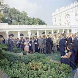 | Keywords: Kennedy Peace Corps group 1961 B003a.jpg August 28 1961 - President Kennedy hosts a ceremony at the White House Rose Garden in honor of the first groups of Peace Corps Volunteers departing for service in Ghana and Tanzania Two days later the first group of 51 Peace Corps Ghana Volunteers arrived in Accra Ghana to serve as teachers https //www facebook com/USEmbassyGhana/photos/pb 146328372149587 -2207520000 1445769554 /818514384930979/ type 3 theater Facebook profile of the US Embassy Ghana 1961-08-28 official photographer of the US government PD-USGov This photo was publicised by the US Embassy in Ghana with the license public US Peace Corps in Ghana John F Kennedy in 1961 White House Rose Garden Relations of Tanzania and the United States |