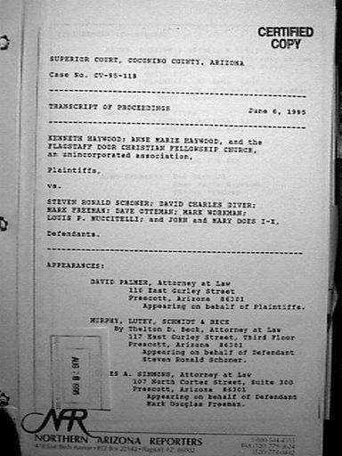 | Keywords: Kenneth Haywood Perjury.JPG en Opening page of the official court document for Kenneth Haywood Civil Case CV-95 00118 Coconino County Superior Court Flagstaff AZ Official Court Document Flagstaff AZ Coconinio County Superior Court CV95-00118 Northern Arizona Reporters 418 East Birch Avenue P O Box 22142 Flagstaff AZ 86001 1995-06-06 none This is the opening page of an Official Court document Kenneth Haywood Opening pages | ||||