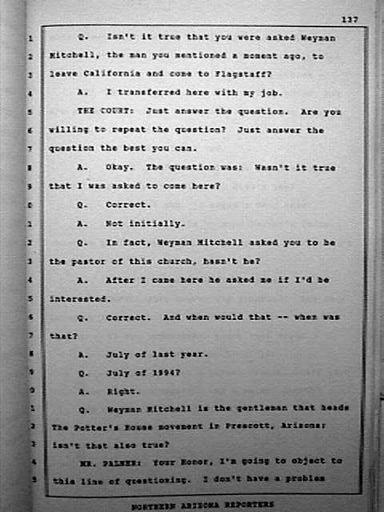 | Keywords: Kenneth Haywood Perjury P137.JPG en Brutal CROSS-EXAMINATION of Kenneth Haywood reveals his previous perjury As you read he was evasive so much so that the COURT Judge Flournoy had to intervene to get him to answer Mr Ledbetter's question directly David Palmer Haywood's attorney seeing that his witness is caught in contradictions intervenes with an objection to this line of questioning Official Court Document Flagstaff AZ Coconinio County Superior Court CV95-00118 Northern Arizona Reporters 418 East Birch Avenue P O Box 22142 Flagstaff AZ 86001 1995-06-06 Kenneth Haywood |