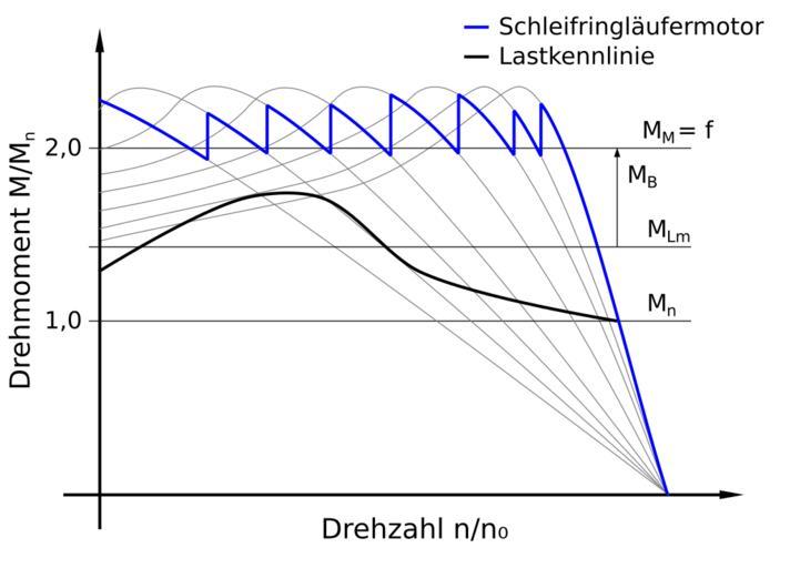 | Keywords: Kennlinie schleifringläufer schweranlauf.svg de de Anlassschwere<br/> M<sub>M</sub> Mittleres Anlassmoment <br/> M<sub>n</sub> Nenndrehmoment <br/> M<sub>Lm</sub> Mittleres Lastmoment <br/> M<sub>B</sub> Resultierendes Beschleunigungsmoment<br/> n<sub>0</sub> Netzfrequenz<br/> Own Biezl Inkscape Electric motor graphs |