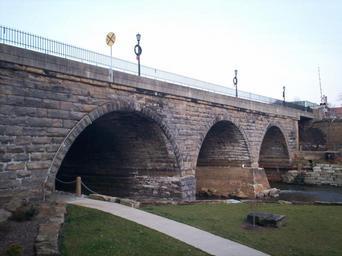 Keywords: KentOhio3.jpg Stone arch bridge in downtown Kent Ohio over the Cuyahoga River; built in 1877 Own 2006-12-30 JonRidinger Kent Main Street Bridge