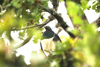 | Keywords: birds nature animals new zealand newzealand green wood pigeon woodpigeon pigeon kereru maori native foliage trees summer outdoor Hiding atop a giant old Oak tree, this enigmatic bird, waits for the distraction to pass, so he can fly down, to gorge on Bangalow Palm berries.Berries are the Kereru’s favourite food all the year round — Puriri in the summer and autumn, Miro in the autumn and winter and Taraire in the winter and spring. Karaka, Nikau and Kahikatea and other berries also supplement their diet where available. During the late winter when there are few or no berries, leaves and shoots provide sustenance. Nesting usually occurs in spring or early summer and their mating is characterised by spectacular aerial displays, by both sexes but particularly males, close to the time of egg laying. I have often watched them flap upwards from a perch, stall and dive, doing the “loop de loop”. By way of explanation for this remarkable behaviour, the locals say they get drunk on Puriri berries, but according to a DOC report, “When a pigeon flies from its perch, glides up to a vertical stall and then glides down to return to the original perch or fly off somewhere else, the perch from which the kereru flies gives the best indication of the general location of its nest.” They lay one egg which is peculiarly long, narrow and white. Both adults brood the egg during the 28 day incubation period. The hen sits through the night and morning with the cock taking over from midday until the evening. Apart from Emperor penguins and flamingoes, pigeons and doves are the only birds to produce food for their chicks. They feed their chicks, called squabs, crop-milk, a protein rich, cottage cheese like secretion from the crop wall. At first crop milk is the only food but, as chicks grow, regurgitated foods form an increasingly large share of the diet. Like many long lived birds, Kereru breed very slowly. Studies in Northland, Hawkes Bay and Marlborough have found that fewer than 15 per cent of chicks survive long enough to become independent. If this decline continues the species will not be able to sustain itself. Although habitat loss is a major concern, the most serious threat comes from predators, especially Homo sapiens. Their conservation is important because they play a key ecological role in the regeneration of native forest by dispersing seeds of trees and shrubs such as Miro, Tawa, Karaka, Puriri and Taraire, too large to be dispersed by other birds. A couple of years ago, the Waikato and Bay of Plenty Conservation Boards initiated a Kereru counting project aimed at farmers with remnants of bush on their land. The project was also aimed at encouraging landowners to fence off bush, to trap and poison predators and plant tree lucerne in the short term while native trees recovered or became established. It is good to see that many landowners have picked up the challenge and adopted these birds as their own. Kereru is usually a silent bird, something which can be unnerving when one finds them sitting on a branch, usually in the deep shade of a tree quietly observing one. A soft “ku” is sometimes heard along with the growl of the hen bird and the slightly sibilant whistle of welcome to their own. The various Maori names, kuku, kereru, kukupa, tend to be onomatopoeic. They also reputed to sometimes shower in light rain, turning over with feet firmly gripping a branch to allow the rain to fall on their bellies. Unlike most birds, pigeons can drink without raising their heads to swallow. They become especially thirsty while eating berries, something Maori used to their advantage in hunting them. They would place drinking troughs with nooses beneath berry bearing trees. I am told that these troughs were still in use not too many years ago in the upper reaches of this Valley. There are two sub species, novaeseelandiae, which breed on the three main islands and chathamensis, which breed on the Chatham Islands and which are a larger bird. A third sub species is extinct, spadicea which survived on Norfolk Island until the 1800s. They seem totally unafraid of man which is much to their detriment. They are entirely vegetarian not even feeding insects to their young as do the honey eaters. Harmless as a dove is an old adage, and like the dove the symbol of purity and peace, they are faithful to their mates, defenseless, gentle and innocent of sin. - See more at: www.nzbirds.com/birds/kereru.html#sthash.l1YOb9Xu.dpuf Hiding atop a giant old Oak tree, this enigmatic bird, waits for the distraction to pass, so he can fly down, to gorge on Bangalow Palm berries.Berries are the Kereru’s favourite food all the year round — Puriri in the summer and autumn, Miro in the autumn and winter and Taraire in the winter and spring. Karaka, Nikau and Kahikatea and other berries also supplement their diet where available. During the late winter when there are few or no berries, leaves and shoots provide sustenance. Nesting usually occurs in spring or early summer and their mating is characterised by spectacular aerial displays, by both sexes but particularly males, close to the time of egg laying. I have often watched them flap upwards from a perch, stall and dive, doing the “loop de loop”. By way of explanation for this remarkable behaviour, the locals say they get drunk on Puriri berries, but according to a DOC report, “When a pigeon flies from its perch, glides up to a vertical stall and then glides down to return to the original perch or fly off somewhere else, the perch from which the kereru flies gives the best indication of the general location of its nest.” They lay one egg which is peculiarly long, narrow and white. Both adults brood the egg during the 28 day incubation period. The hen sits through the night and morning with the cock taking over from midday until the evening. Apart from Emperor penguins and flamingoes, pigeons and doves are the only birds to produce food for their chick