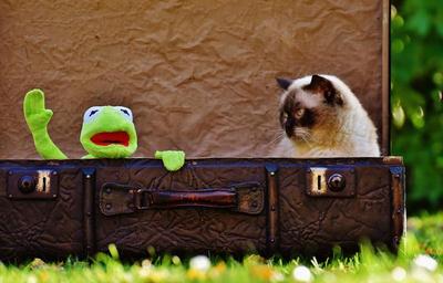 Keywords: kermit cat british shorthair farewell cute children funny sweet luggage antique leather old suitcase junk generations travel go away wave soft toy animal frog stuffed animal