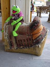 Keywords: kermit frog green doll fig costume leather pants laugh look forward happy sit sofa