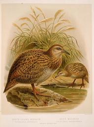 | Keywords: drawing Shows two weka, the left one (South-Island woodhen) on a rock in water, and the right one (Buff woodhen) on the bank. Inscriptions: Inscribed - Recto - bottom right: Judd & Co. Limited, Imp.. Quantity: 1 colour art print(s) in book.. Physical Description: Chromolithograph, 277 x 229 mm Keulemans, John Gerrard, 1842-1912. Keulemans, John Gerrard, 1842-1912 :South-Island woodhen (ocydromus australis). Buff woodhen (ocydromus brachypterus) / J. G. Keulemans delt. & lith. [Plate XXXV. 1888].. Buller, Walter Lawry (Sir) 1838-1906 :A history of the birds of New Zealand. 2d ed. London, John van Voorst, 1888.. Ref: PUBL-0012-35. Alexander Turnbull Library, Wellington, New Zealand. natlib.govt.nz/records/22674741 Shows two weka, the left one (South-Island woodhen) on a rock in water, and the right one (Buff woodhen) on the bank. Inscriptions: Inscribed - Recto - bottom right: Judd & Co. Limited, Imp.. Quantity: 1 colour art print(s) in book.. Physical Description: Chromolithograph, 277 x 229 mm Keulemans, John Gerrard, 1842-1912. Keulemans, John Gerrard, 1842-1912 :South-Island woodhen (ocydromus australis). Buff woodhen (ocydromus brachypterus) / J. G. Keulemans delt. & lith. [Plate XXXV. 1888].. Buller, Walter Lawry (Sir) 1838-1906 :A history of the birds of New Zealand. 2d ed. London, John van Voorst, 1888.. Ref: PUBL-0012-35. Alexander Turnbull Library, Wellington, New Zealand. natlib.govt.nz/records/22674741 |