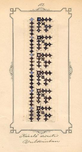 | Keywords: Kezelodiszites vulkanban.jpg en shirt-cuff ornament pattern from cca 1880 from Vulcan then small village in Hunedoara County from the open-access book by István and Gábor Téglás http //www neprajz hu/tartalom php menu2 435 Népviseleti díszítmények Hunyadmegyében István Téglás 1853-1915 1885 PD-old Clothing of Romania Vulcan Romania |